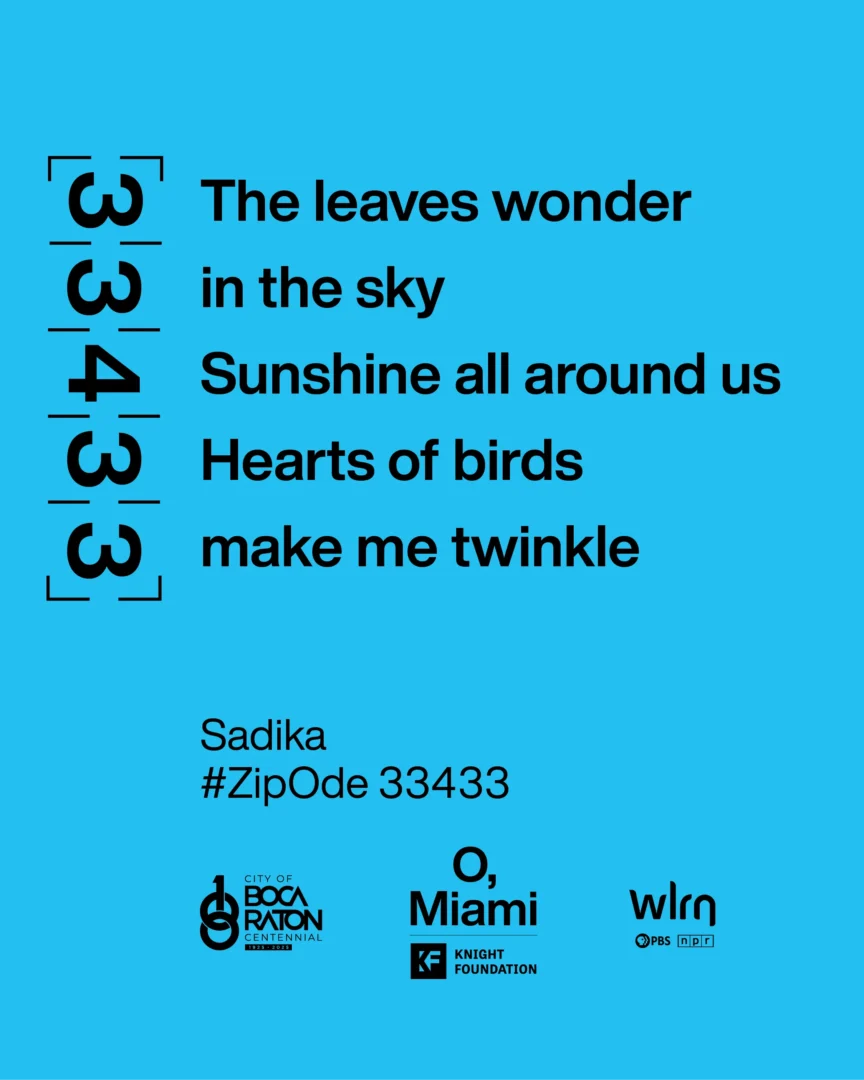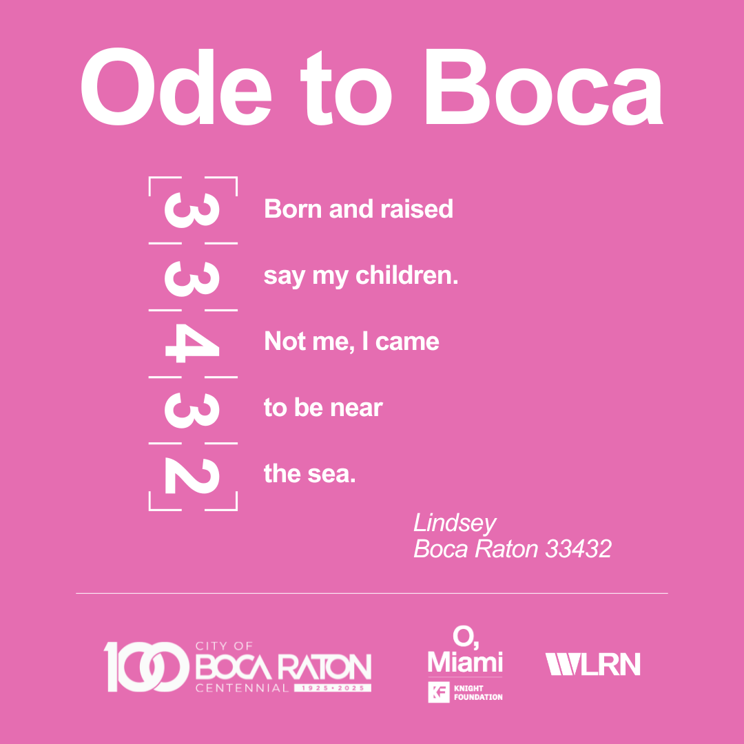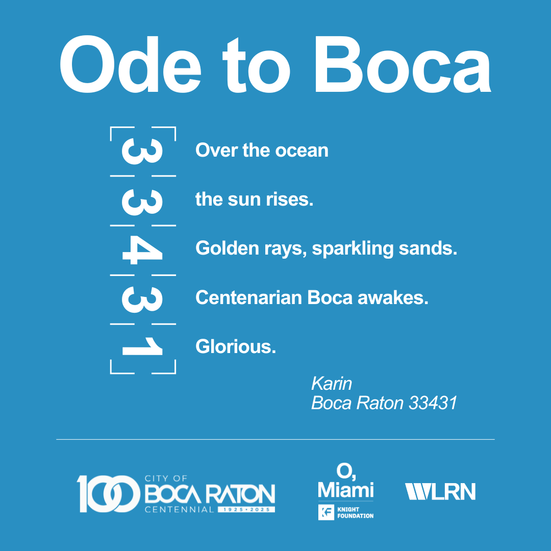 Inspired by O,Miami’s and WRLN’s original ZipOde poetry program, The City of Boca has partnered with O,Miami in creating Ode to Boca, and empowering our community to express their unique perspectives through poetry. The initiative aims to collect 100 place-based poems, which will be