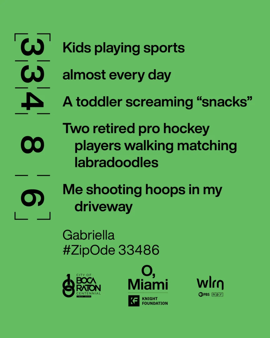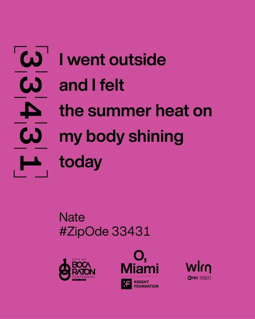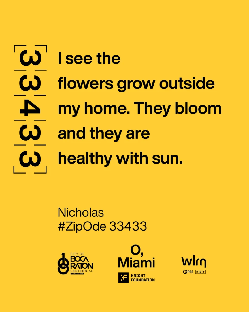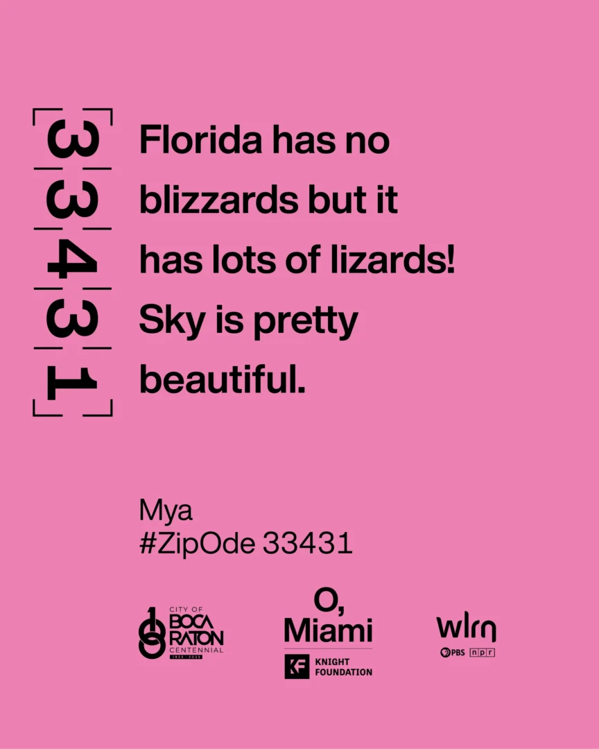 Inspired by O,Miami’s and WRLN’s original ZipOde poetry program, The City of Boca has partnered with O,Miami in creating Ode to Boca, and empowering our community to express their unique perspectives through poetry. The initiative aims to collect 100 place-based poems, which will be